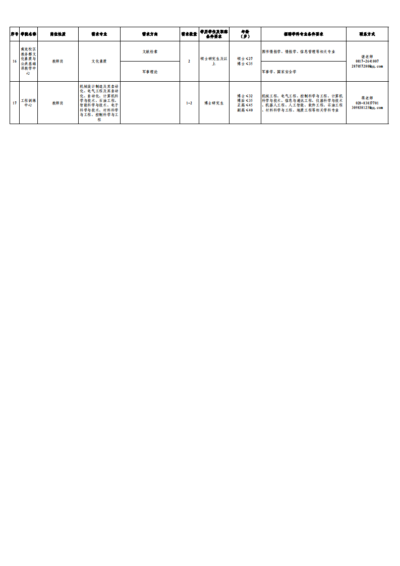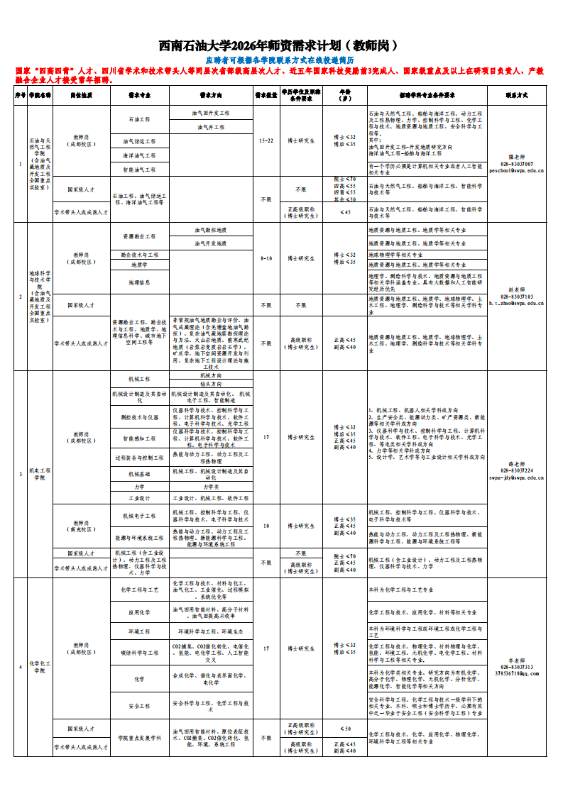西南石油大学2026年师资需求计划(教师岗)