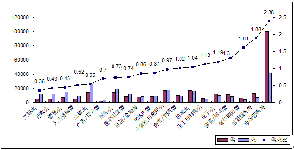 从供求专业比例来看,招聘最难的三类专业岗位是餐饮酒店、后勤服务和市场营销,平均2个职位有1个求职者应聘;而求职竞争最为激烈分别是文秘类、行政类和管理类岗位,平均5个求职者竞争2个职位,两者的求人倍率分别为1.96和0.41,相差4.7倍,是有统计以来差距最小的一次,表明供求专业结构性矛盾日趋平和,招聘和求职双方压力均有得到缓解。