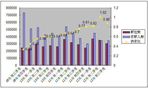 2012年第3季度,共有14871家企事业单位通过人才市场进行招聘,提供了304182个职位,求职人数共计344289名,供求比例为1:1.13。(供方:指用人单位提供的职位,求方:指个人求职,下同。)