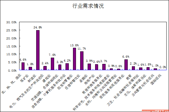 从产业看,全省第一、二、三产业需求人数所占比重依次为4.6%、36.6%和58.8%。从行业需求看,68.7%的用人需求集中在制造业(24.8%)、批发和零售业(13.8%)、住宿和餐饮业(11.7%)、建筑业(7.6%)、居民服务和其他服务业(6.6%)、信息传输计算机服务和软件业(4.2%)。