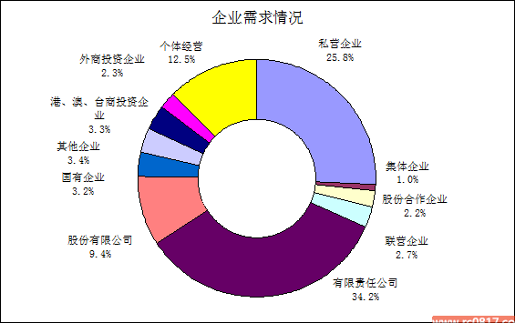 在企业用人需求中,内资企业占81.9% ;港、澳、台商投资企业的用人需求比重为3.3%;外商投资企业的用人需求比重为2.3%;个体经营的用人需求比重为12.5%。