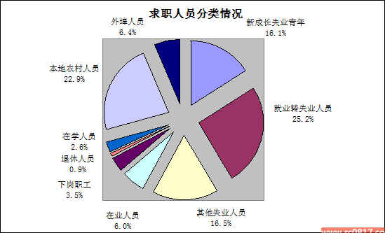 在所有求职人员中,失业人员所占比重为57.8%,其中,新成长失业青年占16.1%,就业转失业人员占25.2%,其他失业人员占16.5%;外来务工人员的比重为29.3%,外来务工人员是由本地农村人员和外埠人员组成,其所占比重分别为22.9%和6.4%。