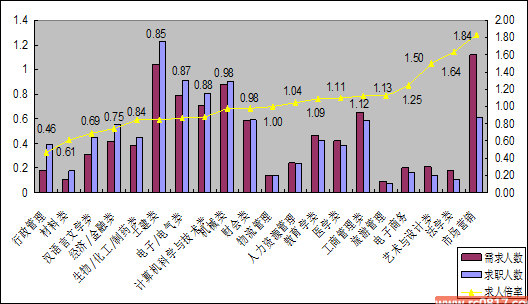 从需求排名前20位专业的供求对比情况看,行政管理专业岗位求职竞争最激烈,平均100名求职者竞争46个岗位,意味着一半以上人员注定落选。而最让企业感到招聘难的是市场营销类专业岗位,其1.84的求人倍率表明至少有近46%的需求得不到满足。从总体情况看,需求大于供给的平均求人倍率为1.27,供给大于需求的平均求人倍率为0.79,供求之间的专业结构性矛盾进一步缓解,但相对于1.02的总量求人倍率来看,高校毕业生求职压力仍主要来源于供求专业岗位的结构性失衡。