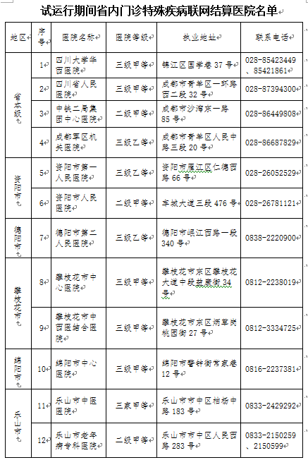 按照“试点先行、逐步推广”的原则,开通试运行期间,省本级、绵阳、德阳、攀枝花、乐山、资阳六地的参保人员,可持社会保障卡在上述六地的12家医院(具体名单附后)联网结算异地门诊特殊疾病费用,7月1日后其他市州将逐步开通门诊特殊疾病即时结算,同时将按规定扩大门诊特殊疾病异地即时结算联网医院范围,方便参保人员选择就医。