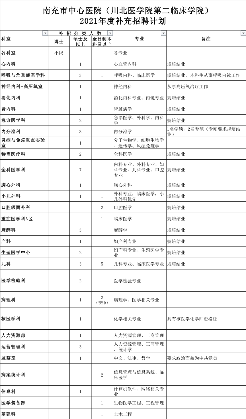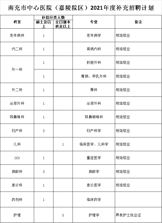 因业务发展需要,南充市中心医院现面向社会招聘工作人员,招聘岗位及条件如下: