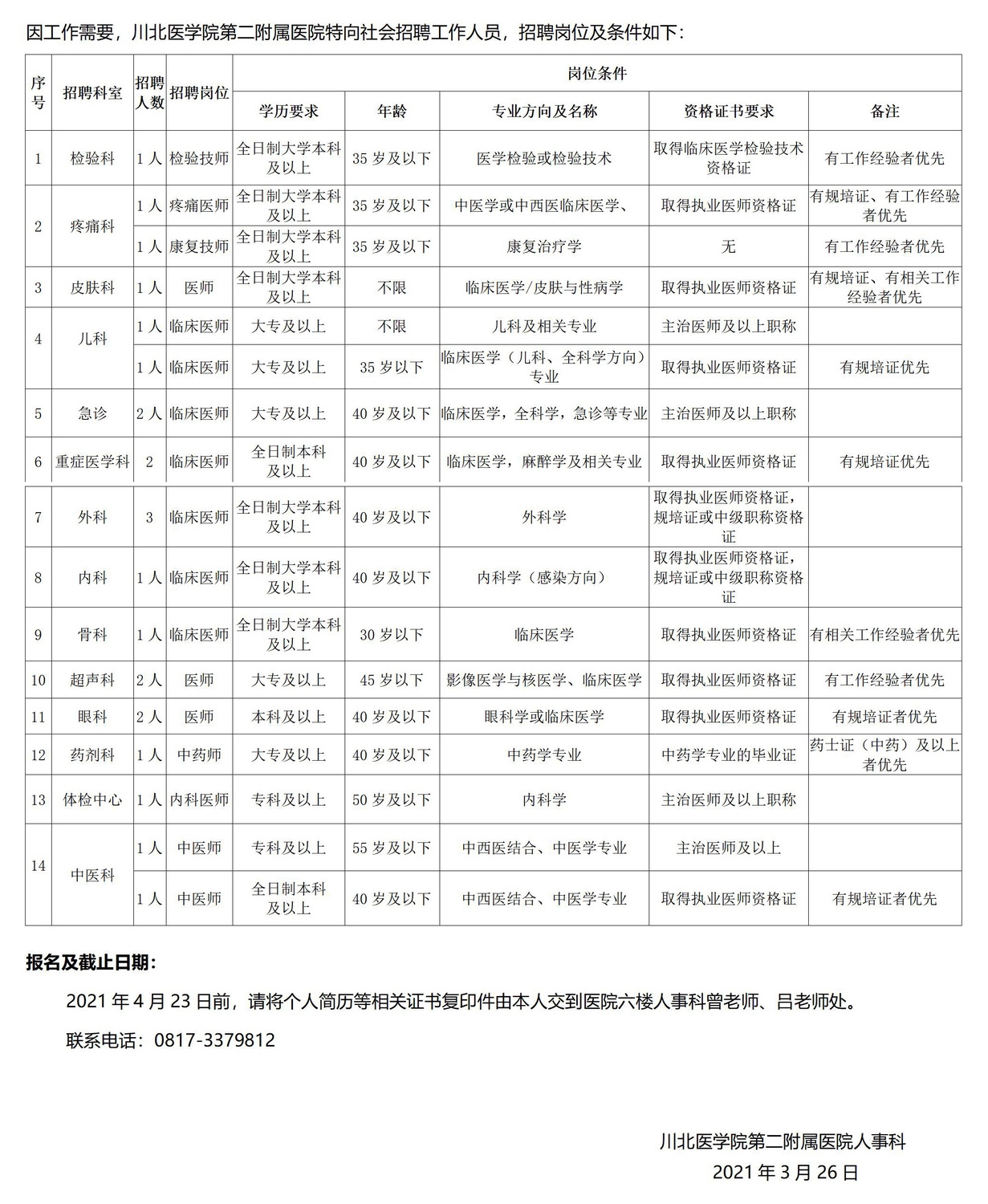 川北医学院第二附属医院2021年3月招聘启事