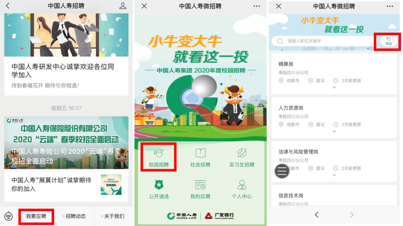 (一)在线申请:2021年3月24日至4月20日网上简历投递,“中国人寿招聘”公众号及中国人寿各成员单位官网均可进入投递页面,每位应聘者可填写3个志愿,更多招聘详情,敬请关注“中国人寿招聘”官网及公众号。1.电脑端:“中国人寿招聘”官网